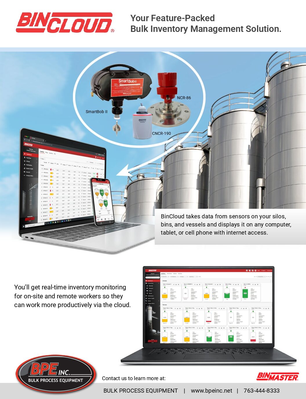Measure silo volumes and monitor bin inventory data remotely. BinCloud takes data from sensors on your silos, bins and vellels and displays it on any computer, tablet, or cell phone with internet access. You’ll get real-tie inventory monitoring for on-site and remote workers so they can work more productively via the cloud.
