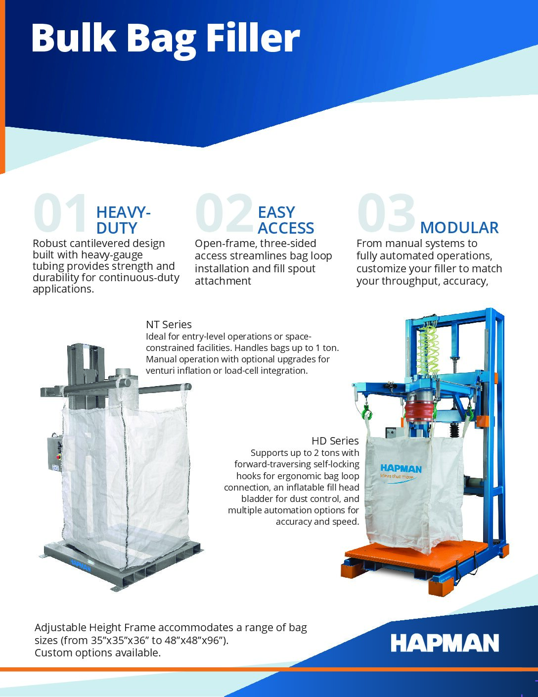 Hapman manufactures FIBC Bulk Bag Fillers ranging from simple low volume options to fully automated systems with integrated palletization and shrink wrapping. Hapman partners with Greif-Velox to supply the ultimate solutions for dust free filling of challenging ultra-light powders.
