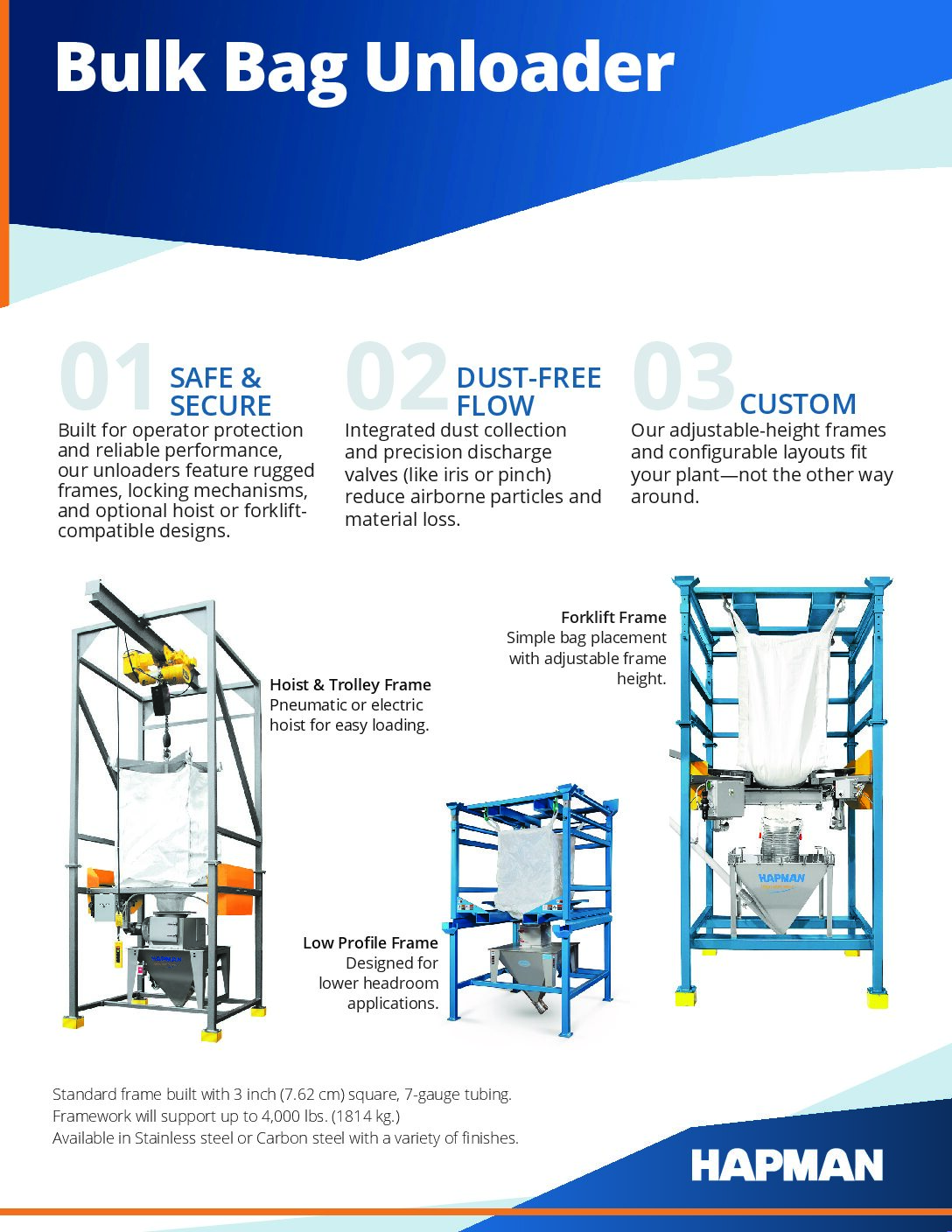 Hapman’s Bulk Bag Unloaders are designed and built to maximize the efficiency of your bulk bag unloading operation. The availability of multiple models and options ensures the right customization to meet your exact needs.