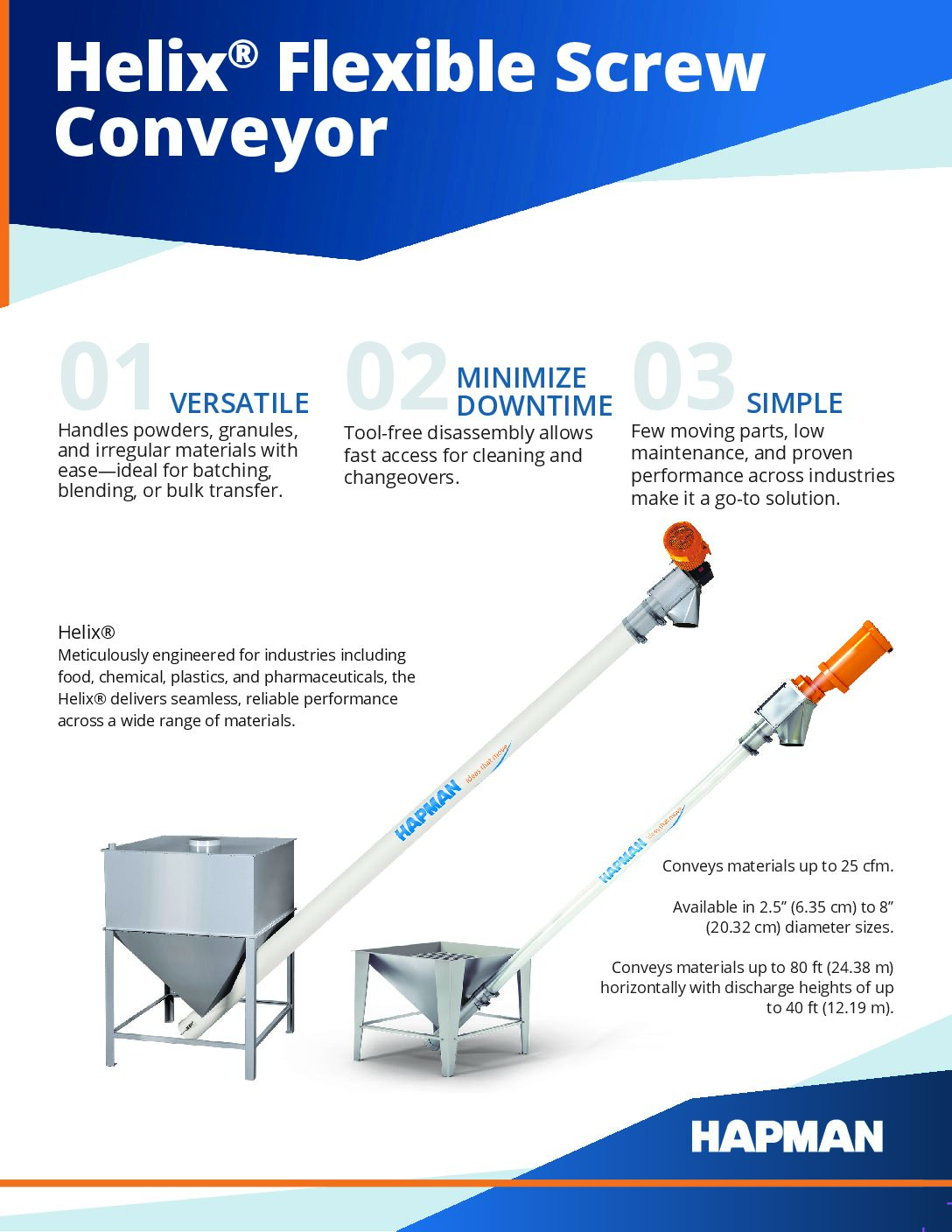 Hapman Helix® Flexible Screw Conveyors are the most efficient, flexible, easy to operate and maintain conveyors on the market. With a single moving part in the standard Helix®, there will be minimal maintenance required.